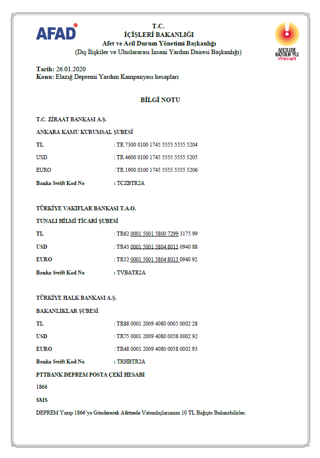 Elazığ Depremi Yardım Kampanyası’na yurtdışından bağış yapmak isteyen vatandaşlarımız ve sivil toplum kuruluşları için T.C. İçişleri Bakanlığı AFAD Başkanlığı’nın deprem yardımları için oluşturduğu aşağıdaki banka hesap bilgilerini saygılarımızla dikkatlerinize sunarız.